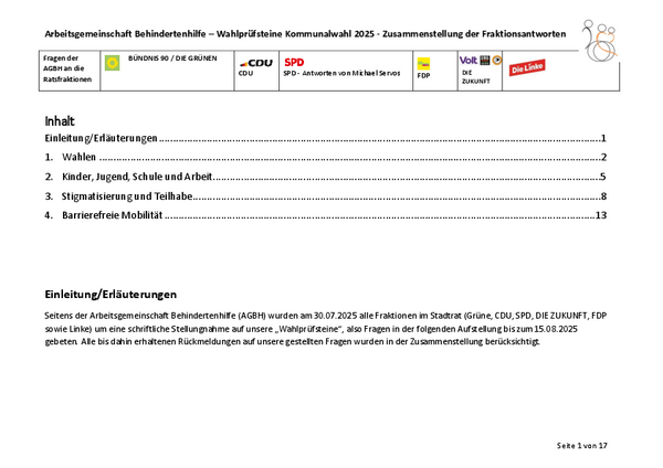 Anlässlich der Kommunalwahl im September 2025 hat die Arbeitsgemeinschaft Behindertenhilfe mit Ihren Mitgliedern Fragen in vier Themenfeldern zur Kommunalwahl in Aachen formuliert. Diese Fragen wurden mit der Bitte um Beantwortung an die Vertreter*innen der Fraktionen gesendet. Zu den Fragen aus den Themenfeldern Wahlen, Kinder/Jugend/Schule/Arbeit, Stigmatisierung und Teilhabe und barrierefreie Mobilität haben Bündnis90/Die Grünen, die SPD (OB Kandidat Michael Servos) und Die Linke Stellung genommen. Die Antworten stehen zum Download als pdf-Datei zur Verfügung.